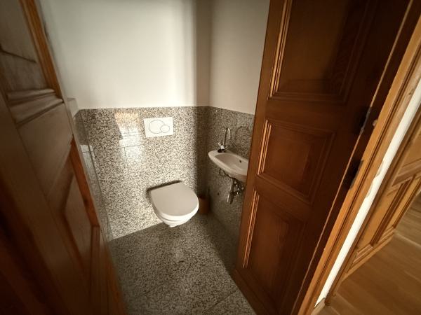 Granit-Fliesen u. Parkett, Tageslichtbad m. Wanne, Dusche, Doppelwaschtisch u. WC, sep. HW-Raum m. WM-Anschl., Gäste-WC, gr. Küche m. Terrasse, Wohnzi. u. Schlafzi. durch gr. Schiebetür getrennt, gr. Flur, kein Energiepass erforderlich nach EnEV § 16 Abs. 5 (Baudenkmal)