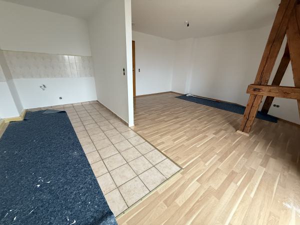 4,5-Raumwohnung, Nutzfläche ca. 125m², off. Küche, innenliegend. Bad m. Wanne u. WM-Anschl., Gäste-WC oben, Laminat u. Fliesen, Balken, begehb. Ankleide, kein Energiepass erforderlich nach EnEV § 16 Abs. 5 (Baudenkmal)