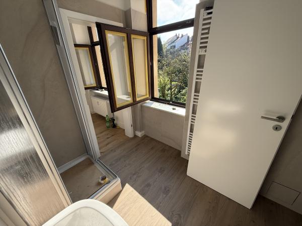 Vinyl, modern. Tageslicht-Bad m. Dusche u. Handtuch-HK a. Schlafzi., WM-Anschl. i. Küche, innenliegend. Küche i. Flur, hell. Räume, kein Energiepass erforderlich nach EnEV § 16 Abs. 5 (Baudenkmal)